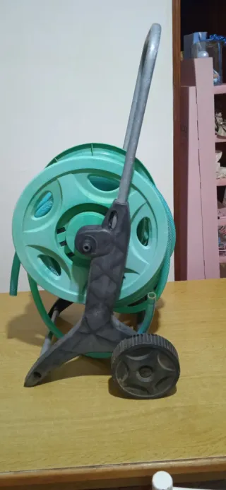 Carrello pratico per avvolgere il tubo dell'acqua. Dotato di ruote per facilitare lo spostamento. - Struttura in plastica e metallo. - Ruote per il trasporto.
