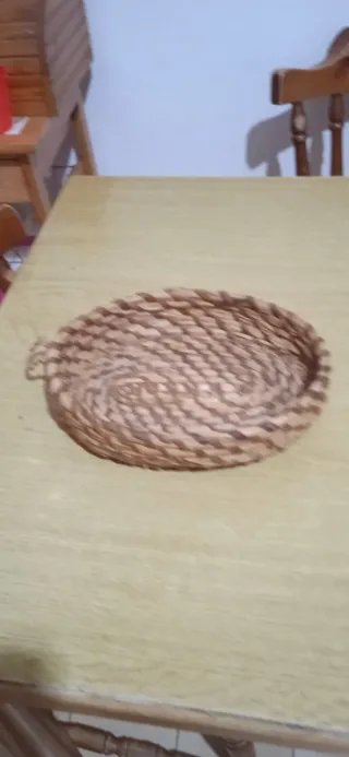 Cestino rotondo realizzato a mano con paglia intrecciata. Perfetto per riporre piccoli oggetti o come elemento decorativo. - Materiale: paglia naturale. - Forma: rotonda. - Tecnica: intreccio a spirale.