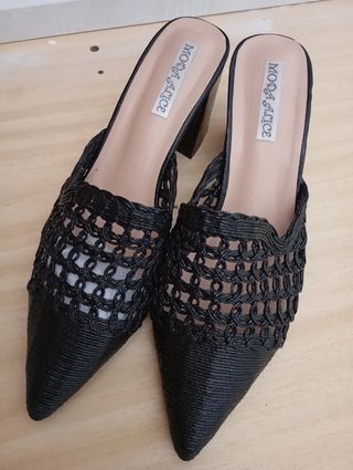 Eleganti sabot neri con tacco, perfetti per completare il tuo look. - Tomaia in rete intrecciata. - Punta a stiletto. - Tacco squadrato.