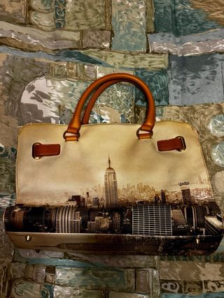 Borsa da donna con stampa di New York. Presenta dettagli in ecopelle color cuoio e una chiusura a lucchetto. - Stampa skyline di New York. - Dettagli in ecopelle color cuoio. - Chiusura con lucchetto dorato.