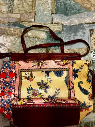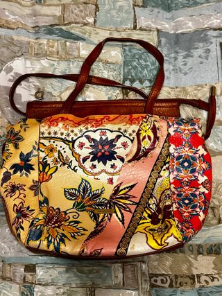 Borsa da donna Desigual con un vivace design patchwork. - Fantasia floreale multicolore. - Dettagli in pelle marrone. - Borsa interna estraibile. - Chiusura con zip.