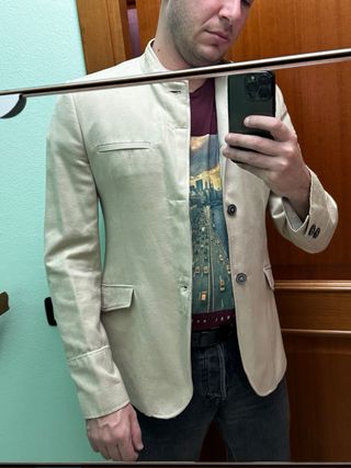 Giacca da uomo in colore beige. - Collo alla coreana - Taschino sul petto - Tasche applicate sul fondo - Chiusura con bottoni - Macchie sulla parte anteriore