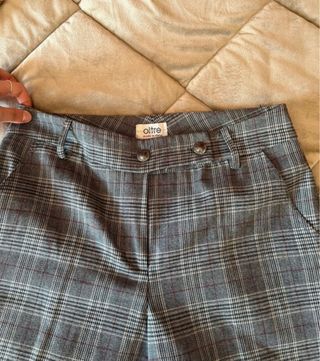 Pantaloni eleganti con fantasia a quadri. - Gamba dritta. - Vita alta. - Chiusura con bottone e zip.