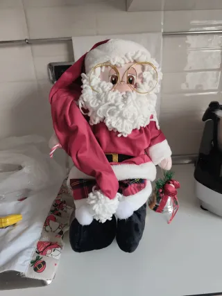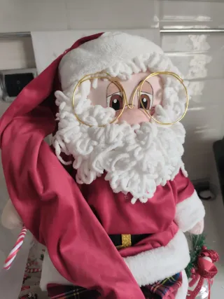 Simpatico Babbo Natale in peluche, perfetto per aggiungere un tocco festivo alla tua casa. - Vestito rosso con cintura dorata. - Cappello da Babbo Natale con pompon bianco. - Barba e baffi bianchi. - Occhiali rotondi dorati. - Dettagli a quadri rossi e neri. - Campanella decorativa con fiocco rosso.