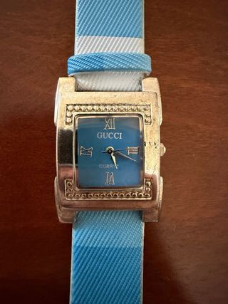 Orologio da polso Gucci con cassa quadrata e quadrante blu. Il cinturino presenta un motivo a quadri sfumati. - Cassa in metallo con finitura argentata. - Dettagli in cristallo attorno al quadrante. - Movimento al quarzo.