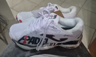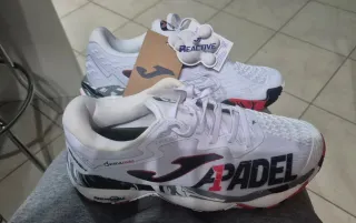 Scarpe da padel Joma da uomo, modello Reactive. - Colore bianco con dettagli neri e rossi. - Logo Joma e scritta Padel sul lato. - Suola Reactive Ball per ammortizzazione. - Etichetta Comfort visibile. Calzano benissimo anche a chi porta il 41 Manca lo scatolo ma le scarpe sono nuovissime,mai usate, con l'etichetta ancora attaccata.