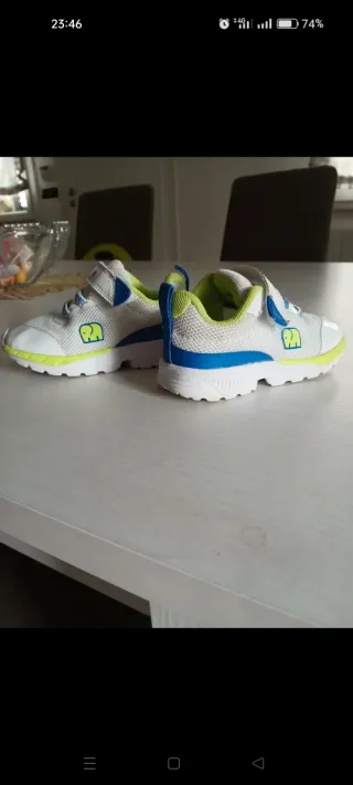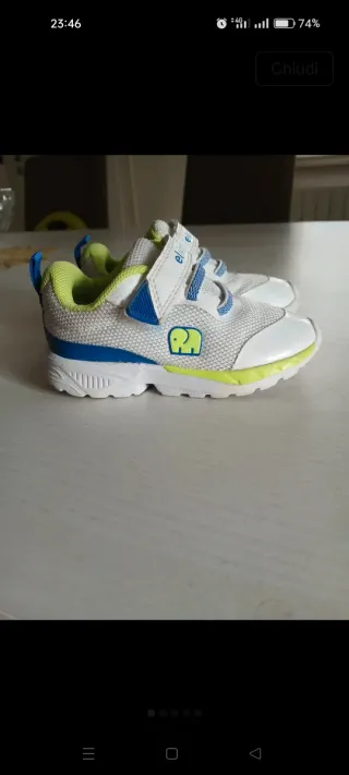 Scarpe da bambino marca Elefanten, taglia 20. - Colore bianco con dettagli blu e lime. - Chiusura con velcro. - Design con simpatico elefantino.