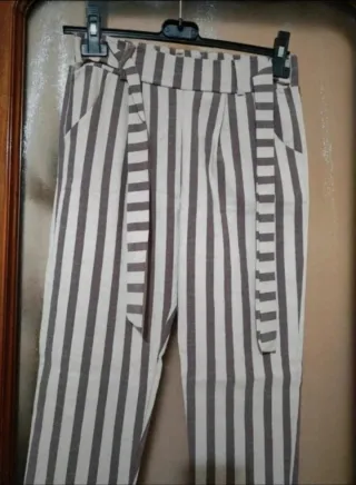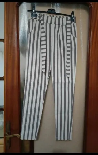 Pantaloni chino da donna con fantasia a righe verticali. Presentano una cintura in vita. - Taglia XS, vita misura 34 cm,con tasche laterali ed elastico dietro, viscosa ed elastico ,nuovo mai usato.lunghezza pantalone dalla vita in giu 96 cm .Made in italy