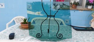 Delizioso carillon vintage con una graziosa statuetta al centro. La base è in ceramica blu decorata con fiori con profili in e disegni in ottone.Il carillon non funzionante da sistemare. - Base in ceramica blu con decorazioni floreali. - Stauetta centrale. - Elementi pendenti in vetro.
