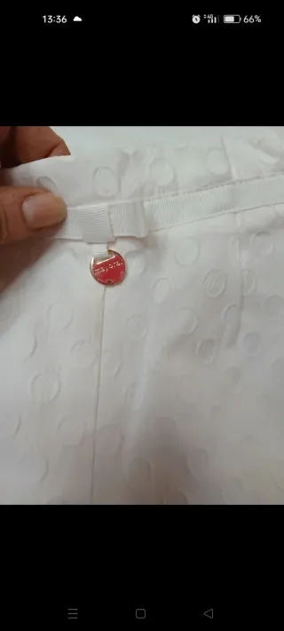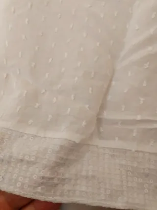 Elegante blusa bianca con un delicato motivo a pois in rilievo e una bordatura scintillante di paillettes sul fondo.Taglia 4 puo andare a una M/L.Misura da un braccio all altro perché maniche scese 72 cm, da ascella ad ascella 62 cm, lunghezza 66 cm. - Tessuto leggero e arioso di cotone. - Maniche corte.Made in Italy