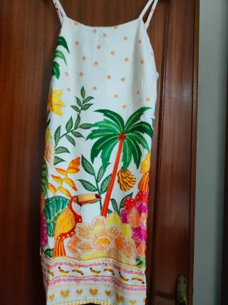 Abito estivo con una vivace fantasia tropicale.Con fascia elastica dietro Taglia unica ,con bratelline regolabili,misura da ascella ad ascella 41 cm, lunghezza vestito 78 cm.