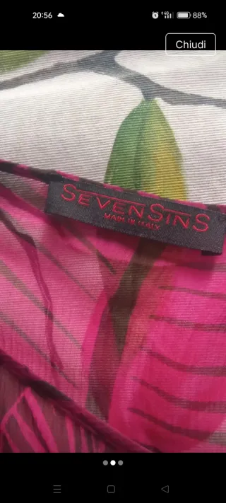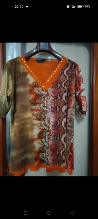 Maglietta con fantasia vivace e dettagli curati. - Scollo a V con perline decorative. - Tessuto leggero e fluido. Taglia M,misura spalla 46 cm,da ascella ad ascella 56 cm, lunghezza 61 cm,come nuova.Mara Carol Made in Italy