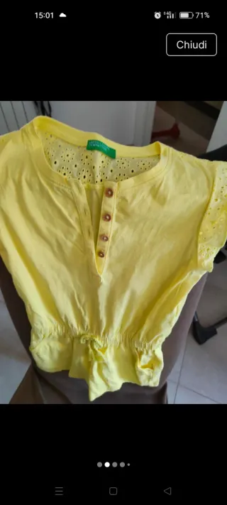 Tuta estiva per bambina Benetton di colore giallo. - Maniche corte con dettagli traforati. - Scollo rotondo con bottoncini. - Elastico in vita con coulisse. - Tasche laterali.
