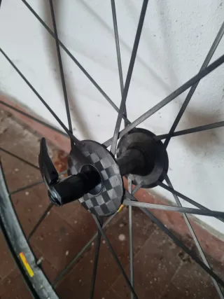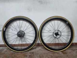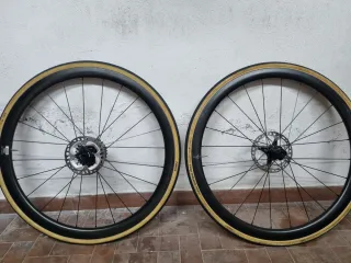 Set di ruote Miche NDR38 per bicicletta. - Cerchi in carbonio. - Mozzi per freni a disco. - Copertoni color sabbia vittoria corsa. Vendo ruote miche ndr38 complete di dischi, pacco pignoni 11-30 12v ultegra e copertoni Vittoria corsa. 4 mila km all attivo