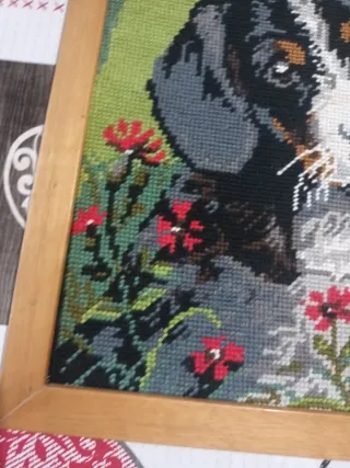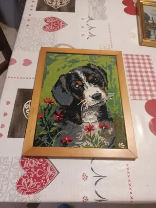 Bellissimo quadretto ricamato a mano raffigurante un cane con fiori. - Cornice in legno. - Ricamo dettagliato su tessuto.