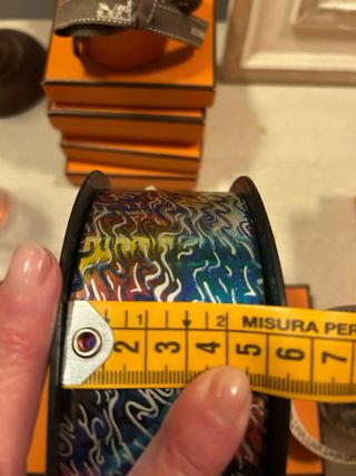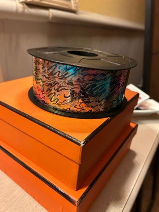 Lunghissimo rotolo di nastro per pacchi regalo con un design olografico e colorato. Perfetto per aggiungere un tocco speciale alle tue confezioni. Nuovo mai utilizzato - Design olografico multicolore. - Rotolo su bobina nera. - altezza cm. 5