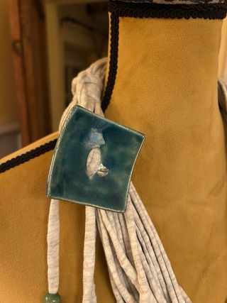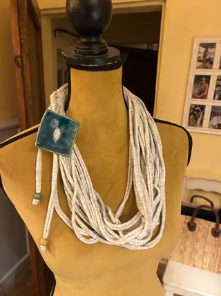 Collana girocollo in tessuto elasticizzato con chiusura quadrata in ceramica. - Chiusura in ceramica color verde acqua. - Perle in legno e ceramica alle estremità. - Tessuto morbido e flessibile.