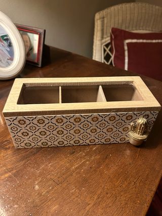 Elegante porta bustine per tè e tisane, perfetto per organizzare la tua collezione. - Design con decoro floreale. - Coperchio trasparente in vetro per visualizzare il contenuto. - Diviso in tre scomparti interni. - Dettaglio decorativo a forma di cactus dorato.