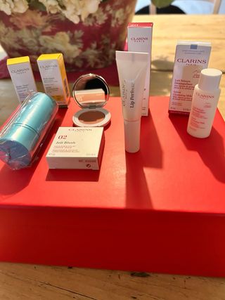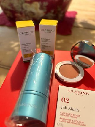 Set di prodotti Clarins per la cura del viso e del corpo. - Include: Joli Blush, Lip Perfector, Huile Tonic, Huile Santé, Lait Démaquillant e pennello da borsa. - Mini taglie ideali per viaggiare o provare i prodotti Con scatola 12 euro (chiedete prima di acquistare)
