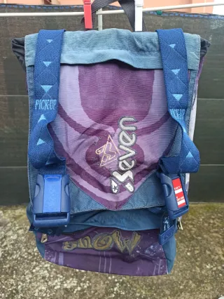 Zaino Seven anni 90 con un design unico e colorato. - Fantasia con onde viola e blu. - Spallacci regolabili blu con dettagli. - Logo Seven sul davanti. - Tasca frontale con zip. - Fondo dello zaino con scritta Snow.