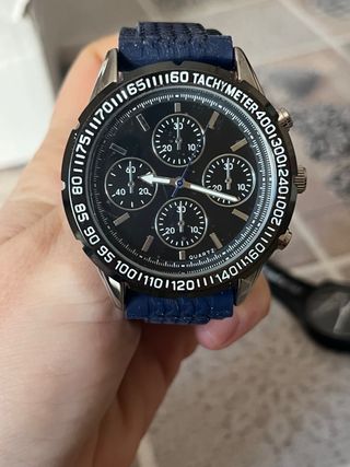 Elegante orologio da uomo Avon con cinturino blu e quadrante nero. - Cinturino in materiale texturizzato blu. - Quadrante nero con dettagli. - Movimento al quarzo.