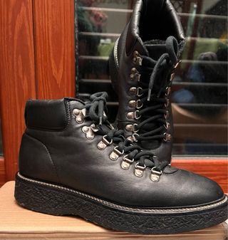 Stivaletti in pelle neri con dettagli in metallo. - Chiusura con lacci e zip laterale. - Fibbia decorativa. - Suola carrarmato.