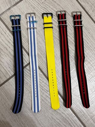 Set di cinturini in nylon per orologi. - Materiale: Nylon - Chiusura: Fibbia in metallo - Design a righe e tinta unita 5 cinturini k&bros vari colori come visibile in foto Vendo solo insieme a 10 € totale non separati per qualsiasi info scriveo