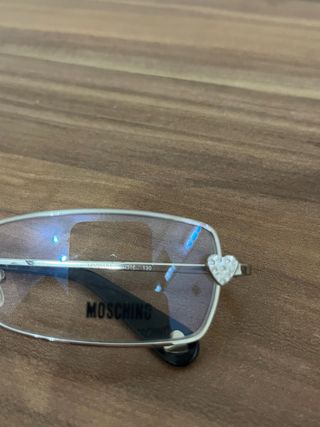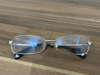 Occhiali da vista Moschino originali Montatura metallica argentata con forma rettangolare elegante. Raffinati dettagli a cuore sui lati che aggiungono un tocco femminile e distintivo. Aste nere con terminali chiari. Stile moderno ed elegante oi Condizioni come da foto • Perfetti per completare un look chic o quotidiano Lenti di prova non graduate Non ho la custodia originale