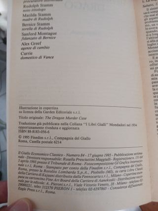Vendo il seguuente libro - Libro tascabile copertina flessibile edizione Gruppo Newton - del 1995 nr. 84, genere Thriller, titolo; 'Il mistero del Drago' Autore; S.S. Van Dine, ISBN 8881830566, costo 1 euro. Andrea