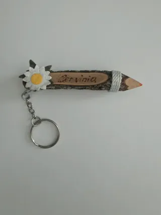Portachiavi a forma di matita con decorazione floreale. - Scritta Cervinia incisa sul legno. - Fiore bianco e giallo applicato. - Cordino bianco avvolto sulla punta. Cod.203