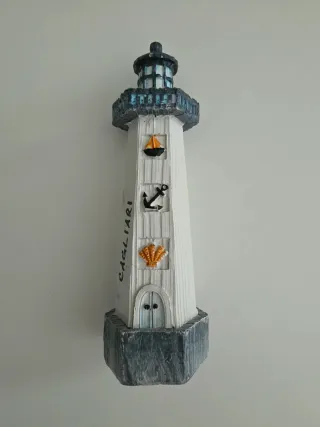Questo è un faro decorativo con il nome Cagliari. - Decorato con una barca a vela, un'ancora e una conchiglia. - Base grigia effetto pietra. - Dettagli blu sulla lanterna. Cod.205