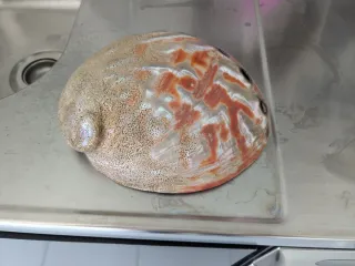 Bellissima conchiglia naturale, perfetta come elemento decorativo. - Superficie esterna ruvida e puntinata. - Interno iridescente con sfumature arancioni e madreperlate.