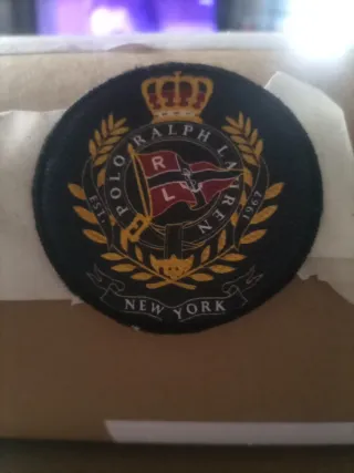 Toppa rotonda con stemma Polo Ralph Lauren. - Design con logo RL centrale. - Cornice decorativa con rami e scritte. - Dettagli in oro su sfondo nero.