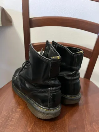 Stivali Dr. Martens neri in pelle. - Modello classico con lacci. - Suola iconica con cuciture gialle. - Design robusto e resistente.