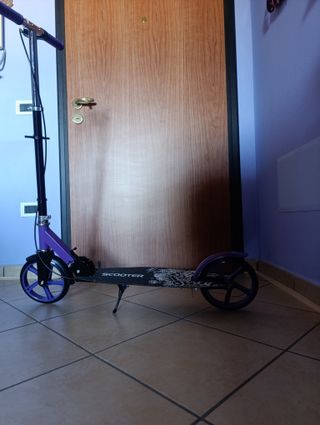 Monopattino non elettrico "Scooter" Viola/nero, nuovo in confezione originale. Pieghevole, manubrio regolabile in altezza, frenata posteriore. Adatto a ragazzi e adulti Possibilità di consegna a mano in zona Cagliari - Colore: Viola e nero. - Design pieghevole per un facile trasporto.