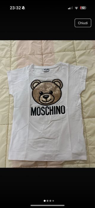 T-shirt bianca Moschino per bambina con iconico orsetto. Taglia 10 anni - Orsetto con paillettes dorate. - Logo MOSCHINO nero a contrasto.