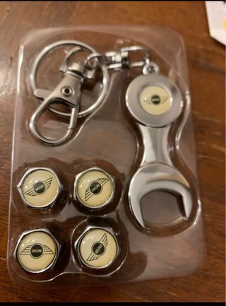 Set di tappi per valvole con logo Mini Cooper e portachiavi. - Quattro tappi per valvole. - Un portachiavi con logo Mini. - Design cromato lucido.