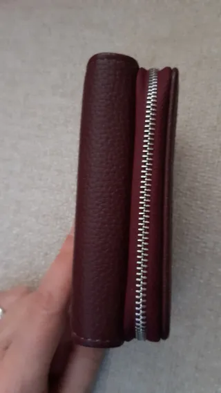 Elegante portafoglio da donna in similpelle color bordeaux. Scomparto per monete con cerniera, 7 scomparti per tessere e carte di credito. Scomparto per banconote. Dimensioni: 12 x 8,5 x 4 cm