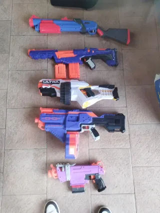 Vendo diversi fucili Nerf, perfetti per il gioco e il divertimento. - Fucile Nerf blu e rosso - Fucile Nerf viola e arancione - Fucile Nerf bianco e giallo ULTRA - Fucile Nerf viola e nero - Fucile Nerf rosa