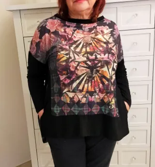 Casacca donna oversize. Misura S ma può essere indossata anche fino alla taglia 48. Misure in sevonda foto. Il dietro è in tessuto trasparente e leggermente più lungo del davanti. Ha profondi spacchi laterali. Nera con una una bella stampa davanti. Ottime condizioni, priva di segni di usura In poliestere leggero ed elastane