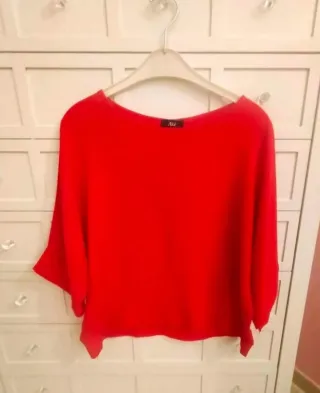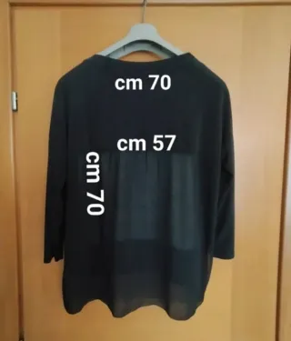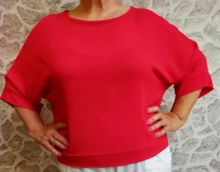 Elegante casacca da donna. - Maniche corte a kimono. - Tessuto leggermente testurizzato. - Scollo rotondo. - Rifinita con bordo alle maniche e al fondo. Pari al nuovo,non presenta segni di usura. Mis S ma veste anche una L. Le misure in foto