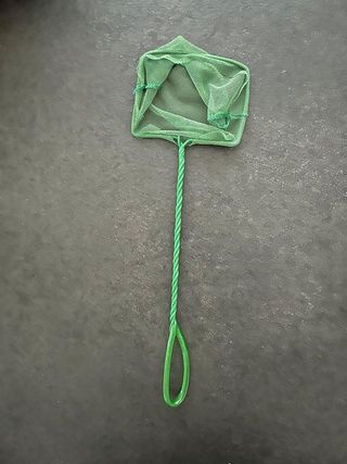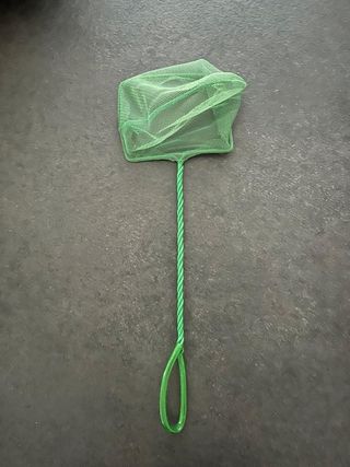 Retino per acquario di colore verde, utile per la pulizia e la manutenzione. - Rete in materiale resistente. - Manico con impugnatura ad anello.