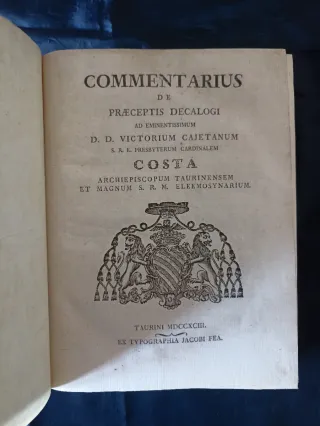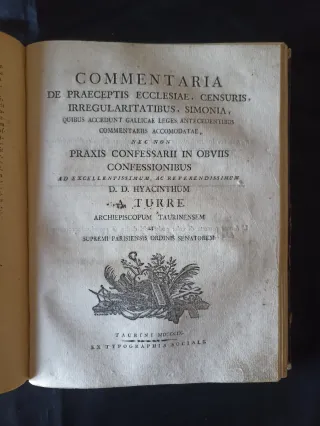 Libro antico raro: "Commentaria de Praeceptis Decalogi et Ecclesiae" - Torino 1793/1809 Stato di conservazione: Pagine interne: In ottime condizioni, considerando l'età del volume. Carte integre, testo perfettamente leggibile, senza mancanze significative o strappi che ne pregiudichino la consultazione. Legatura: La copertina originale presenta segni evidenti del tempo ed è da restaurare/sistemare lungo il dorso e le giunture, come mostrato in foto. Dettagli: Opera completa in due tomi rilegati insieme. Perfetto per bibliofili, appassionati di testi religiosi antichi o restauratori.