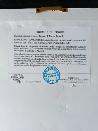 Dettagli storici e certificazione: Autore: Robert Benard (Parigi, seconda metà del XVIII secolo), celebre disegnatore ed incisore che collaborò direttamente all'esecuzione delle tavole dell'Encyclopédie. Origine: Acquistate presso la prestigiosa Libreria Antiquaria Peyrot di Torino. Autenticità: Sul retro è presente il Certificato di Autenticità originale della libreria con timbro a secco. Tecnica: Incisione su rame. Caratteristiche del quadro: Dimensioni totali: 55 x 40 cm.