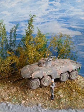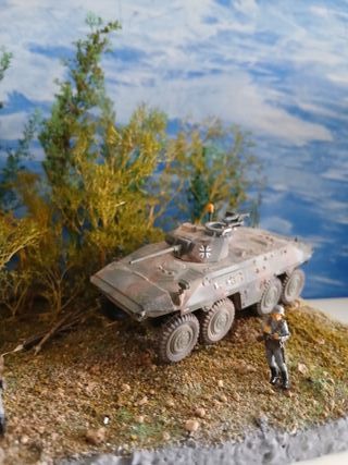 Diorama artigianale ambientato durante la Seconda Guerra Mondiale. Scala 1 72 Dimensioni 25 x 15 x 14 - Veicolo militare corazzato. - Figure di soldati. - Ambientazione con vegetazione Il carro viene fornito di basetta e vetrinetta in plexiglass