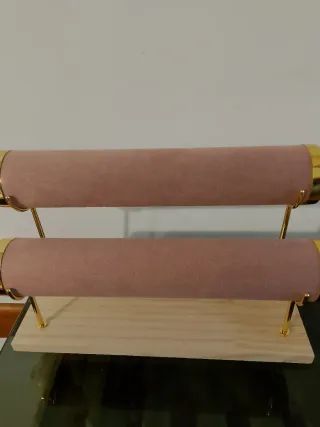 Elegante porta gioie a due livelli, perfetto per organizzare i tuoi accessori. - Struttura in legno con rivestimento in velluto. - Dettagli in metallo color oro.