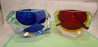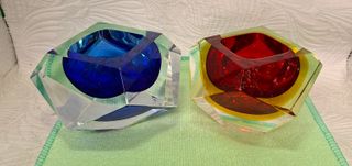 Elegante posacenere in vetro di Murano, design di Flavio Poli per Seguso. - Realizzato in vetro artistico. - Design geometrico e sfaccettato. - Da notare leggera sbeccatura su quello rosso - Colore blu intenso. 14 cm - Colore rosso e giallo. 12 cm