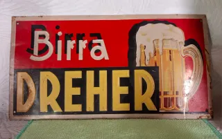 Insegna vintage in latta del marchio Birra Dreher, con un'iconica immagine di una birra. - Design retrò. - Materiale: latta. - Raffigurazione di una birra spillata.