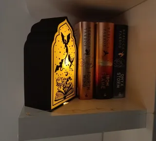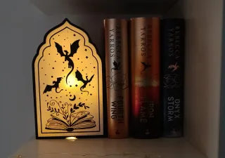 Libreria luminosa a tema Fourth Wing con draghi e libro aperto. - Design a forma di arco con intagli. - Illuminazione calda per creare atmosfera. - Decorazione unica per gli amanti della lettura. Pile e libri non inclusi