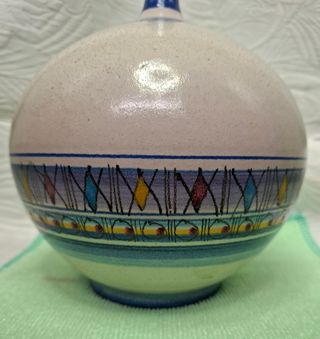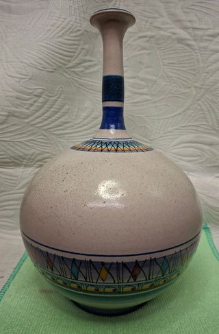 Elegante vaso in ceramica, un pezzo unico che aggiunge un tocco di stile. - Design con decorazioni geometriche. - Finitura beige con dettagli blu. - Altezza 26 cm - Forma arrotondata con collo sottile.